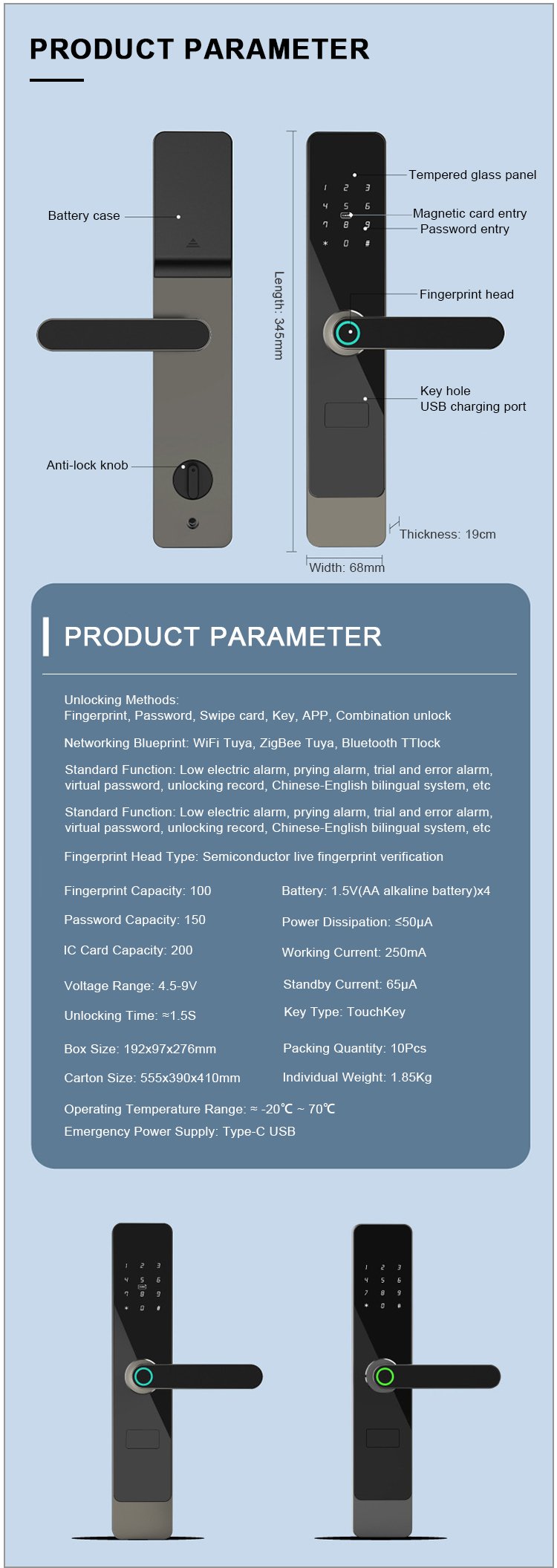 Unlocking Method: Tuya WiFi/Tuya Zigbee/TTlock Bluetooth APP, Fingerprint, Password, Card, Key, Combination unlock