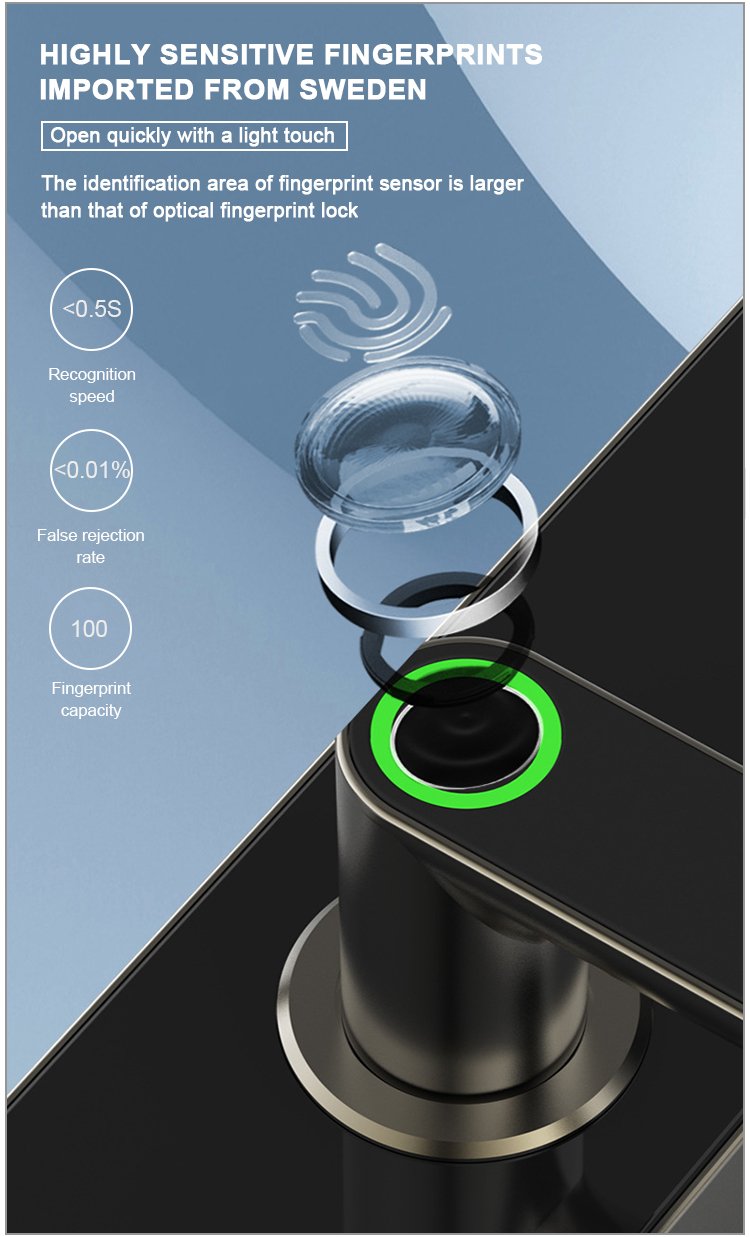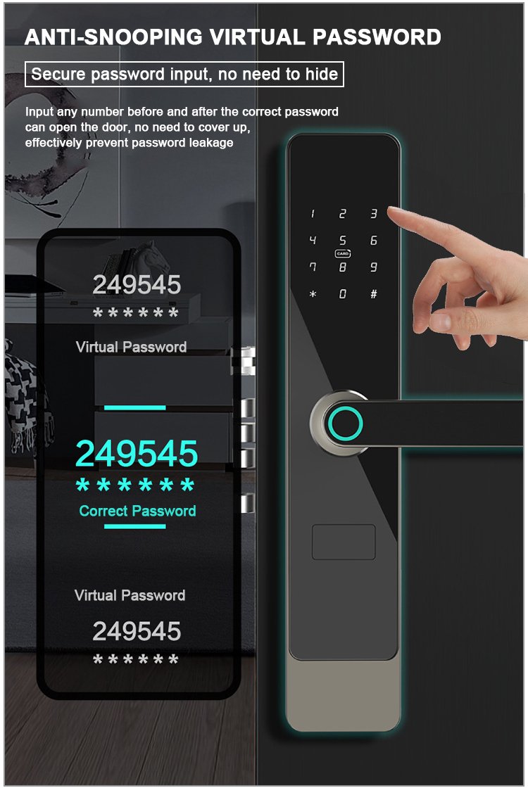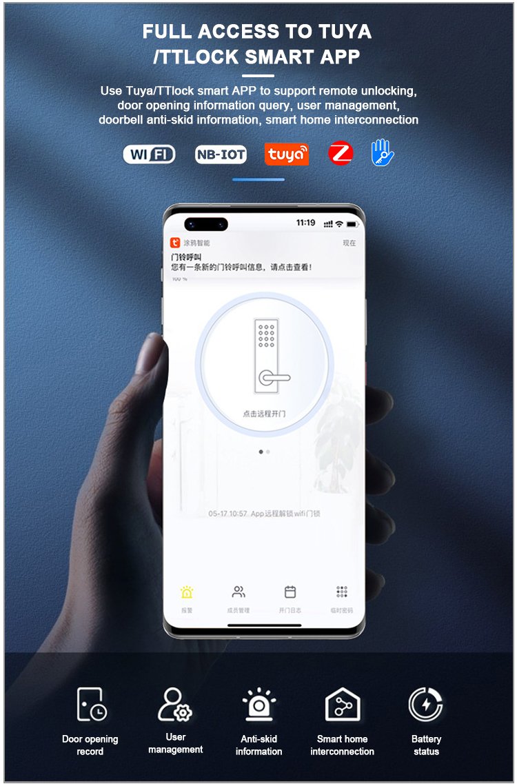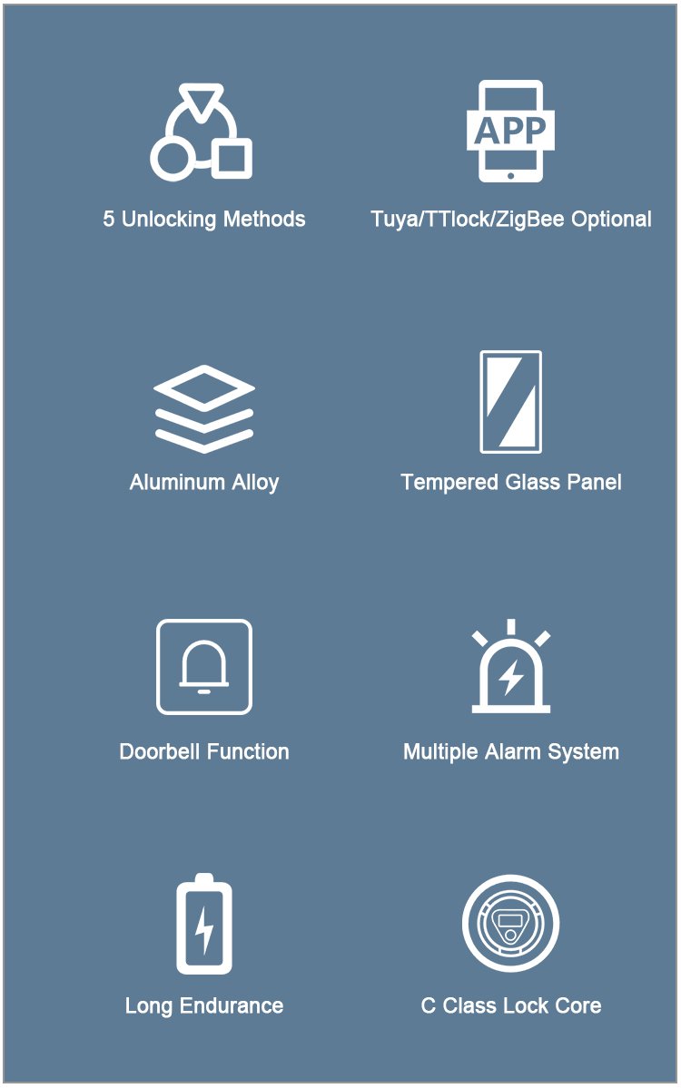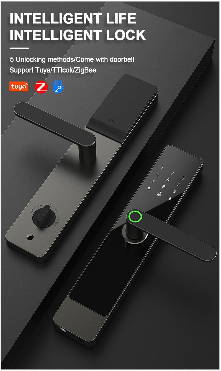 Unlocking Method: Tuya WiFi/Tuya Zigbee/TTlock Bluetooth APP, Fingerprint, Password, Card, Key, Combination unlock