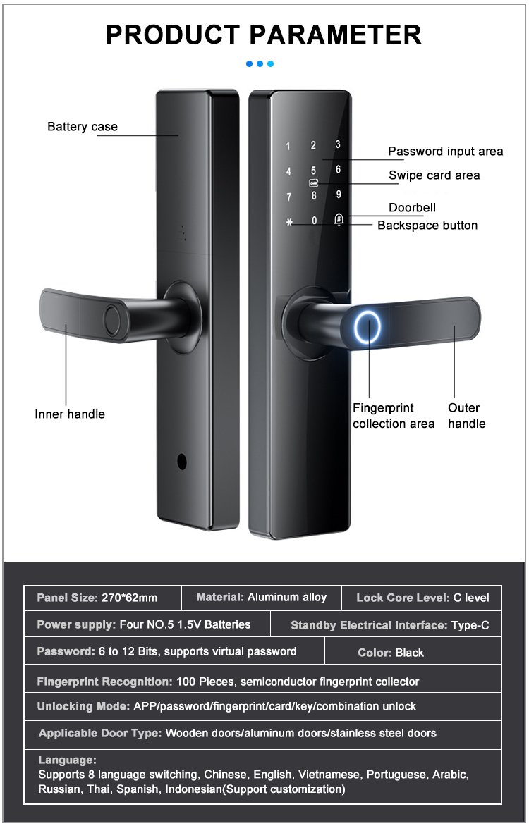 Unlocking Method: TUYA/TTlock APP, Fingerprint,Password,Card,Key