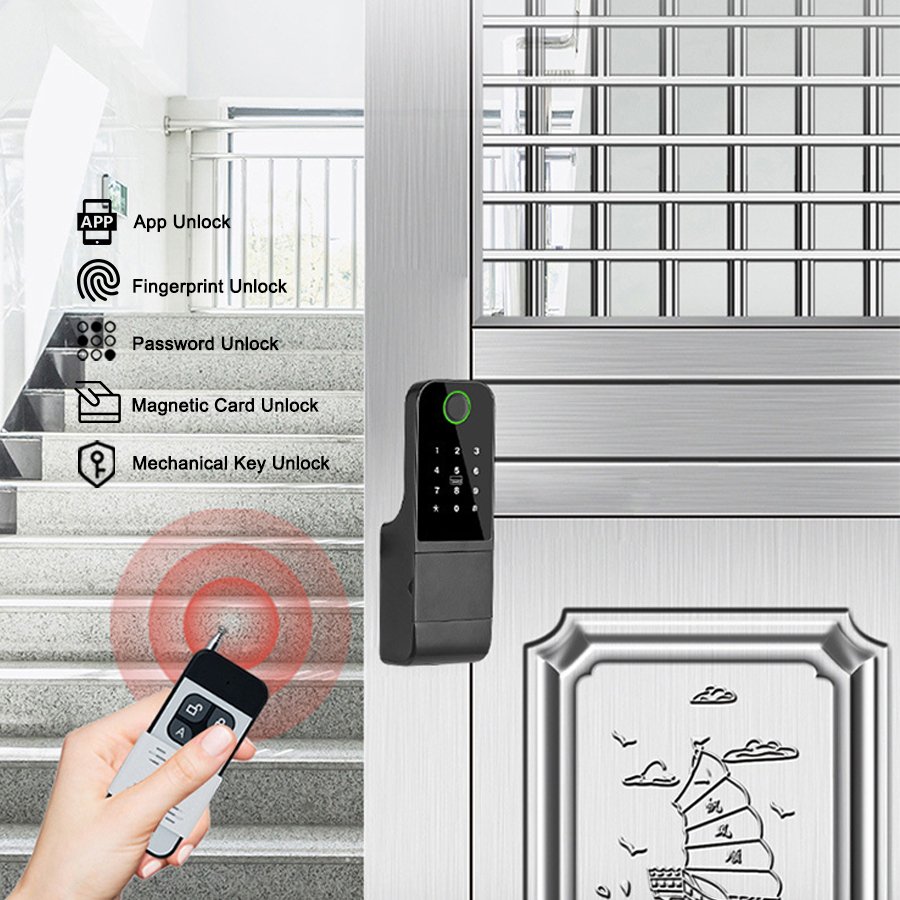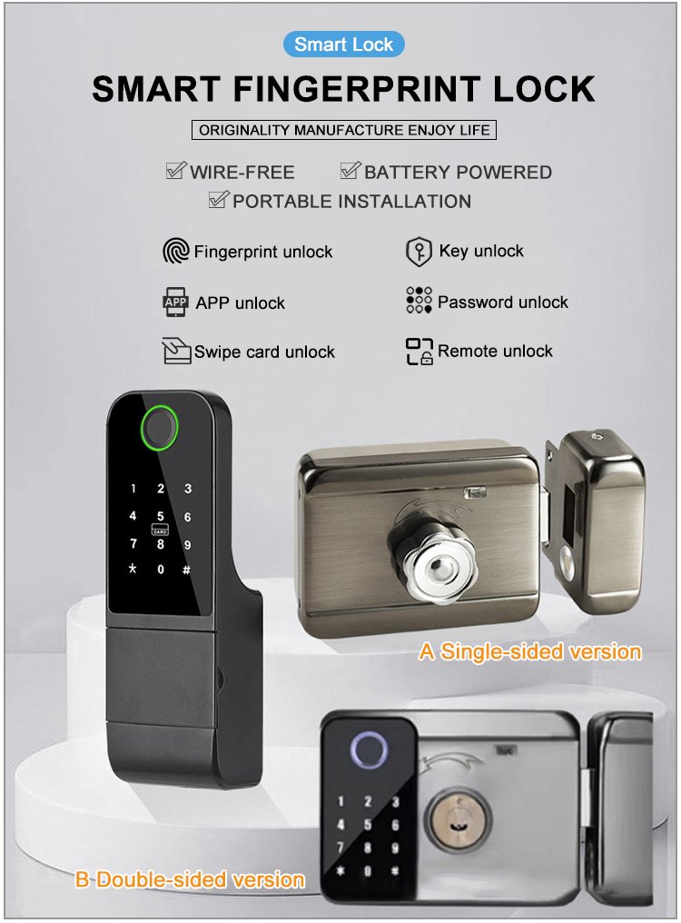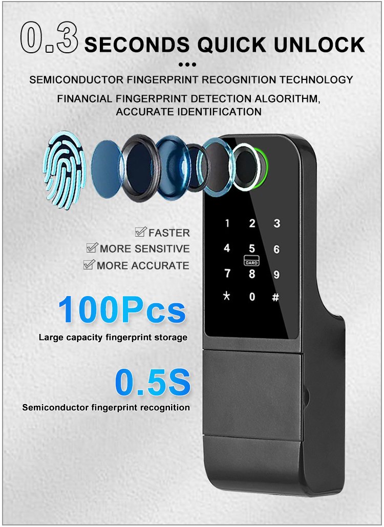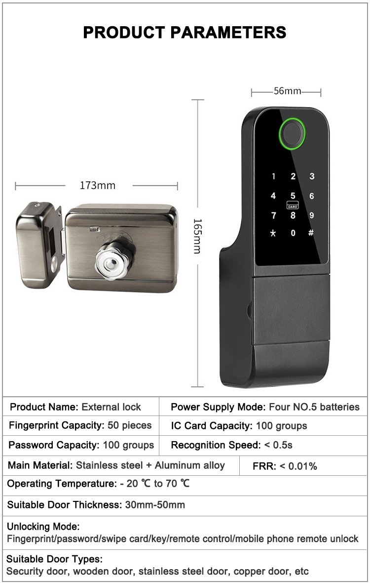 Waterproof: IP66 Unlocking Method: Fingerprint, Tuya WiFi /TTlock Ble APP, Password, Smart card, Key Language: Multiple languages Mortise: Any mortise Material: Aluminum alloy