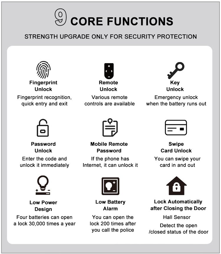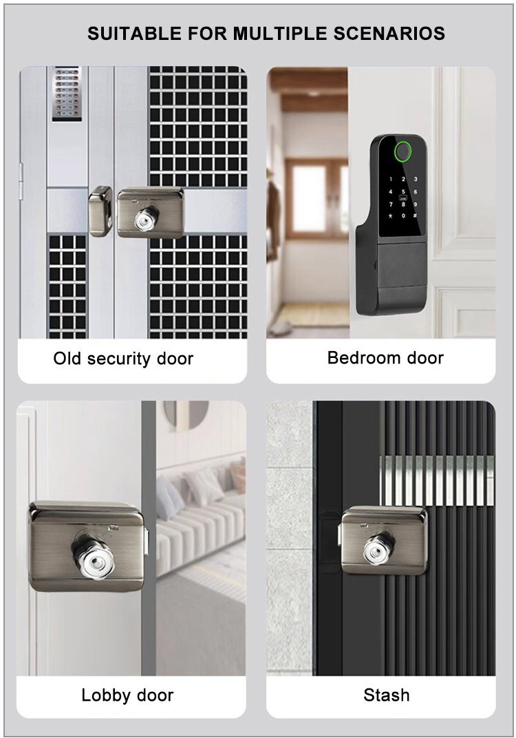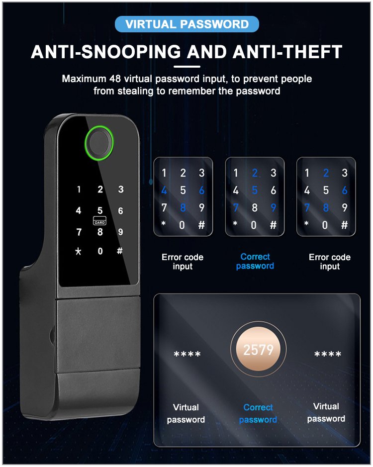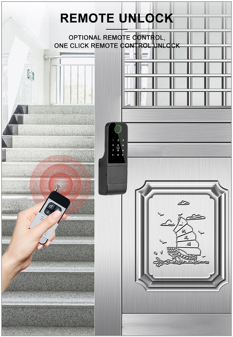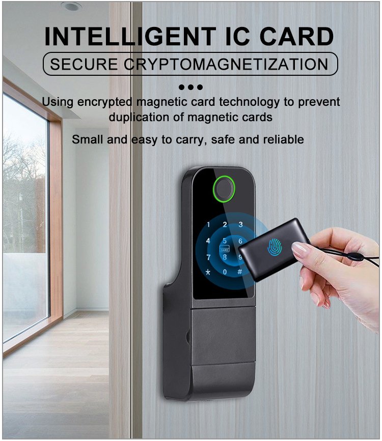 Waterproof: IP66 Unlocking Method: Fingerprint, Tuya WiFi /TTlock Ble APP, Password, Smart card, Key Language: Multiple languages Mortise: Any mortise Material: Aluminum alloy