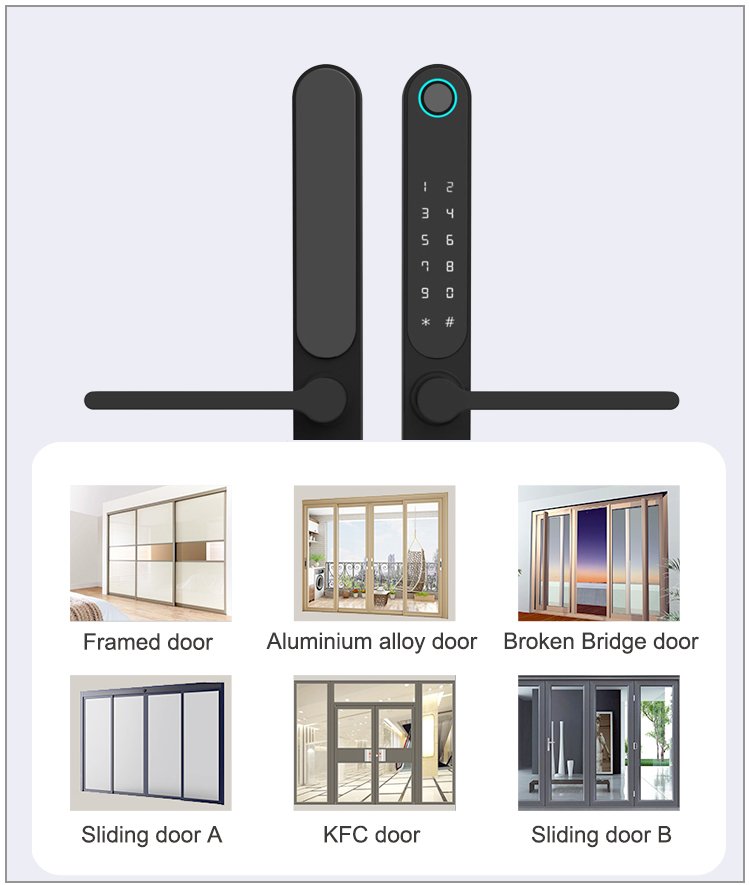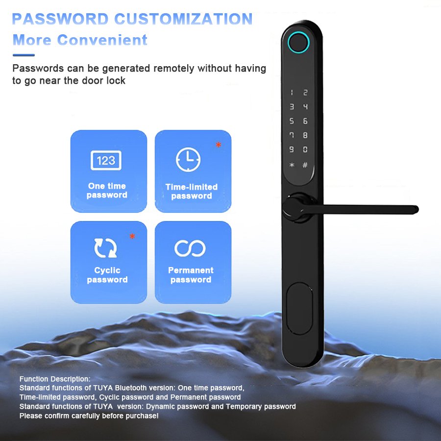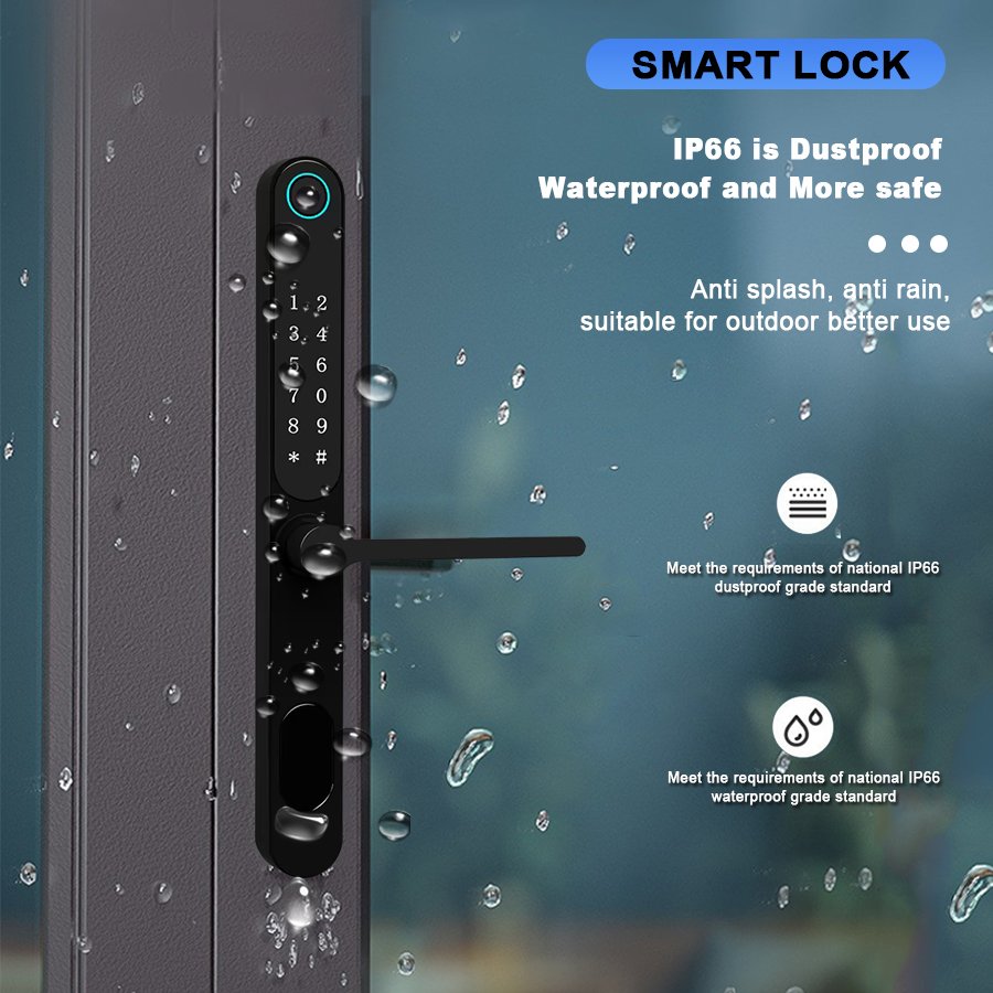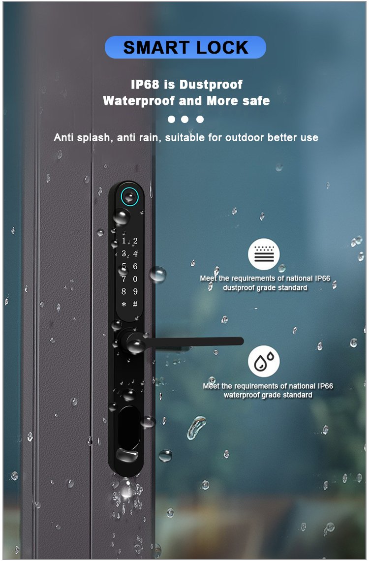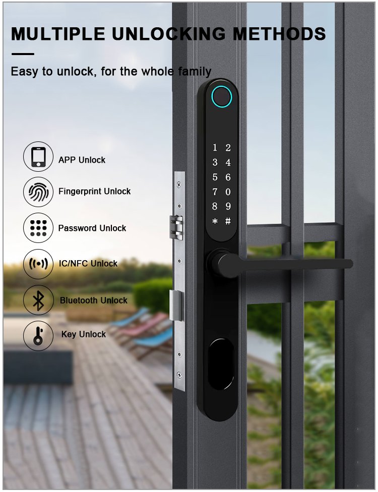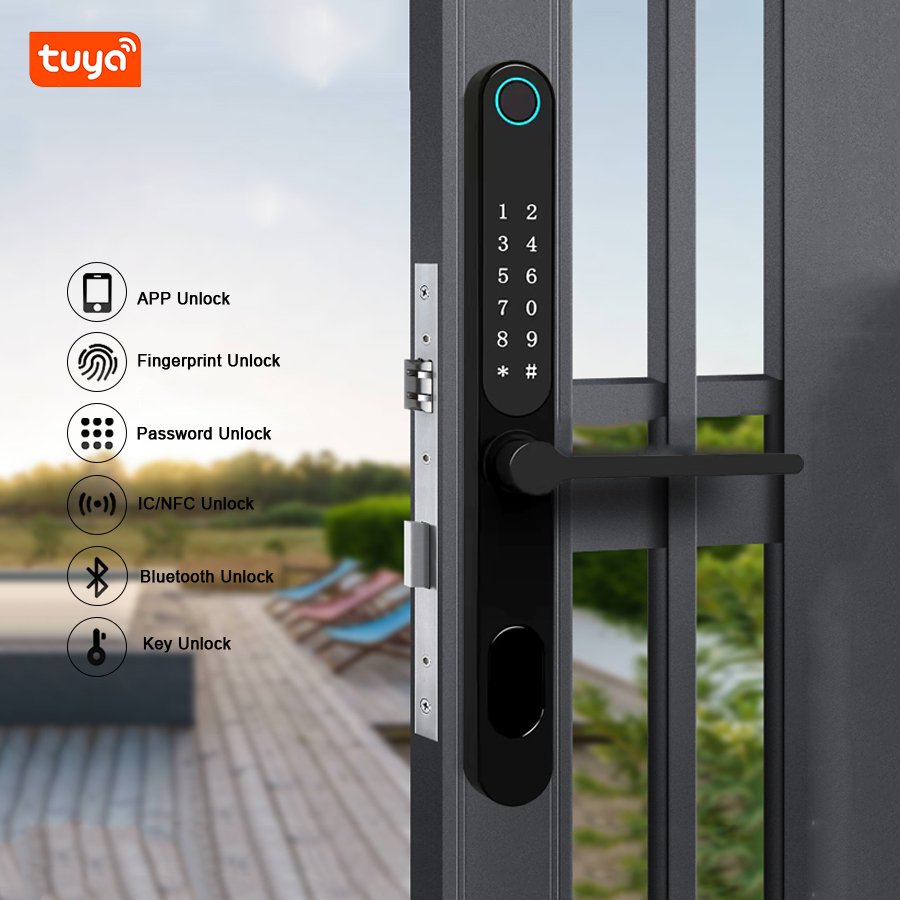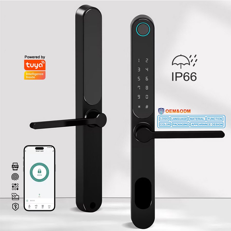 Unlocking Method: TUYA APP, Fingerprint, Password, Card, Key, Combination unlock Waterproof Rate: IP66 Language: English, Chinese and customization Mortise: 3085/3585/4585/5085/6085 Material: Aluminum alloy