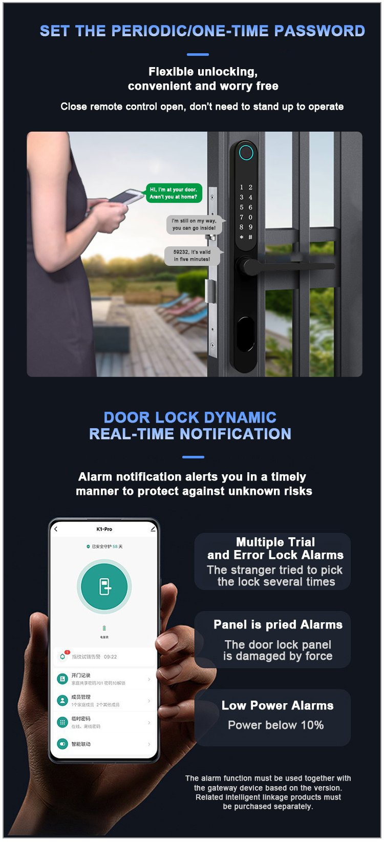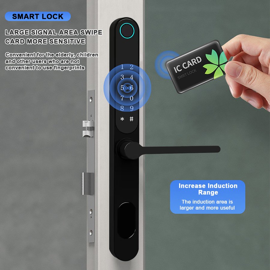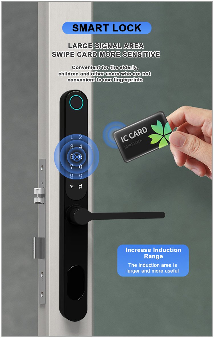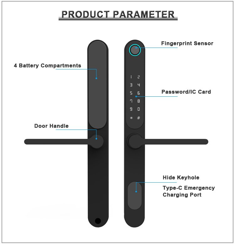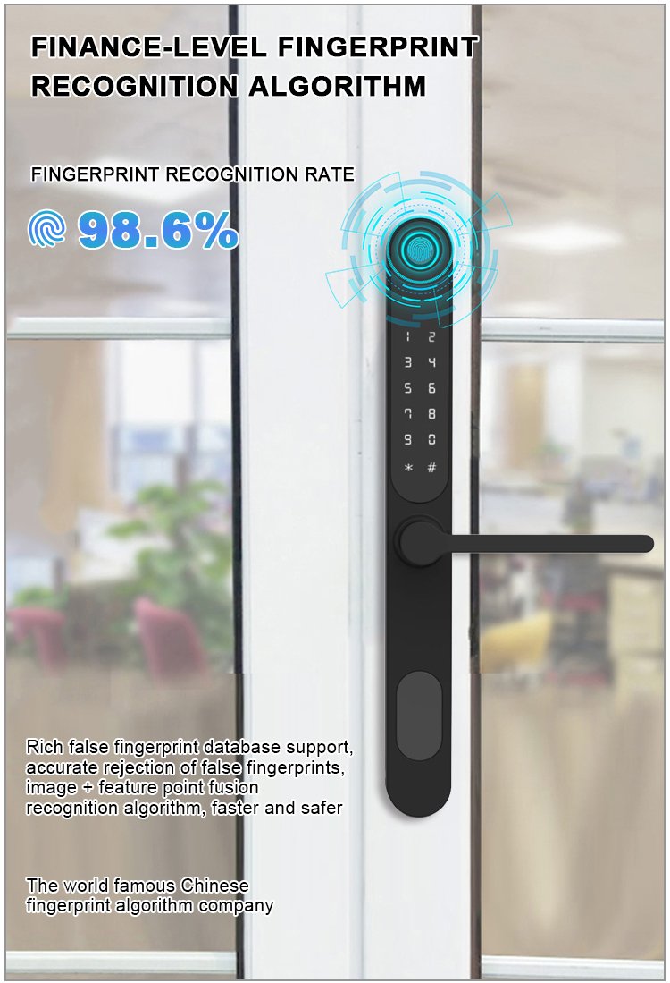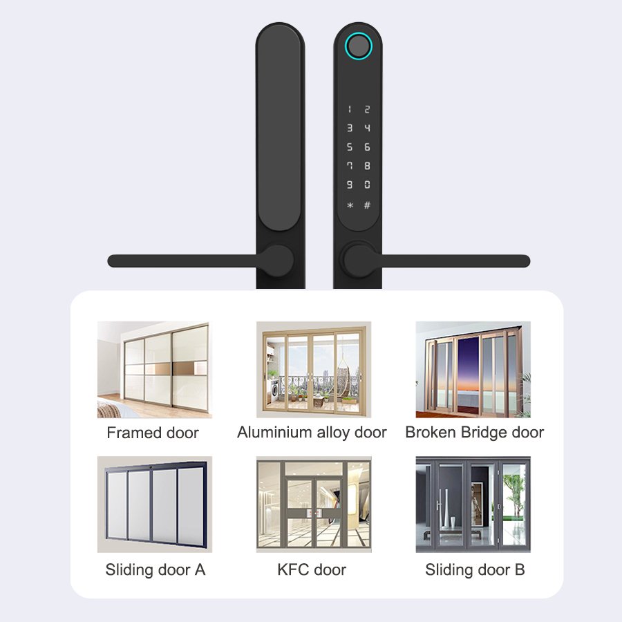 Unlocking Method: TUYA APP, Fingerprint, Password, Card, Key, Combination unlock Waterproof Rate: IP66 Language: English, Chinese and customization Mortise: 3085/3585/4585/5085/6085 Material: Aluminum alloy
