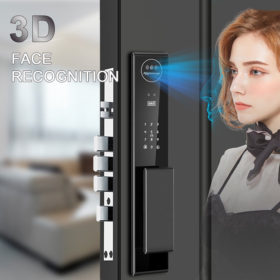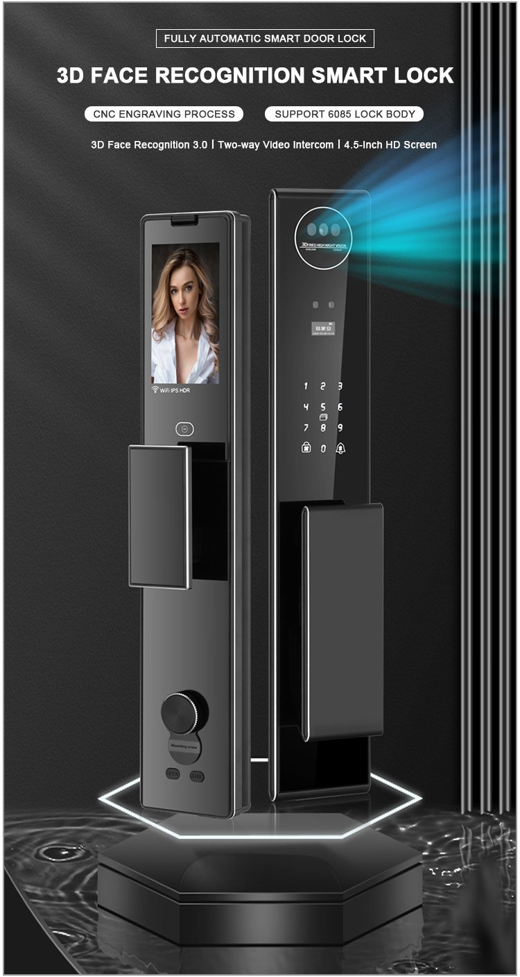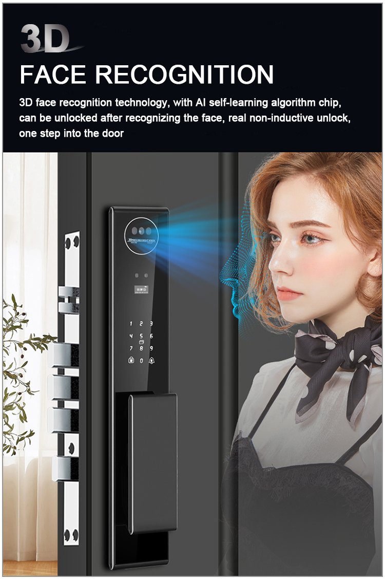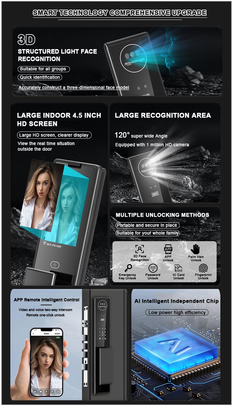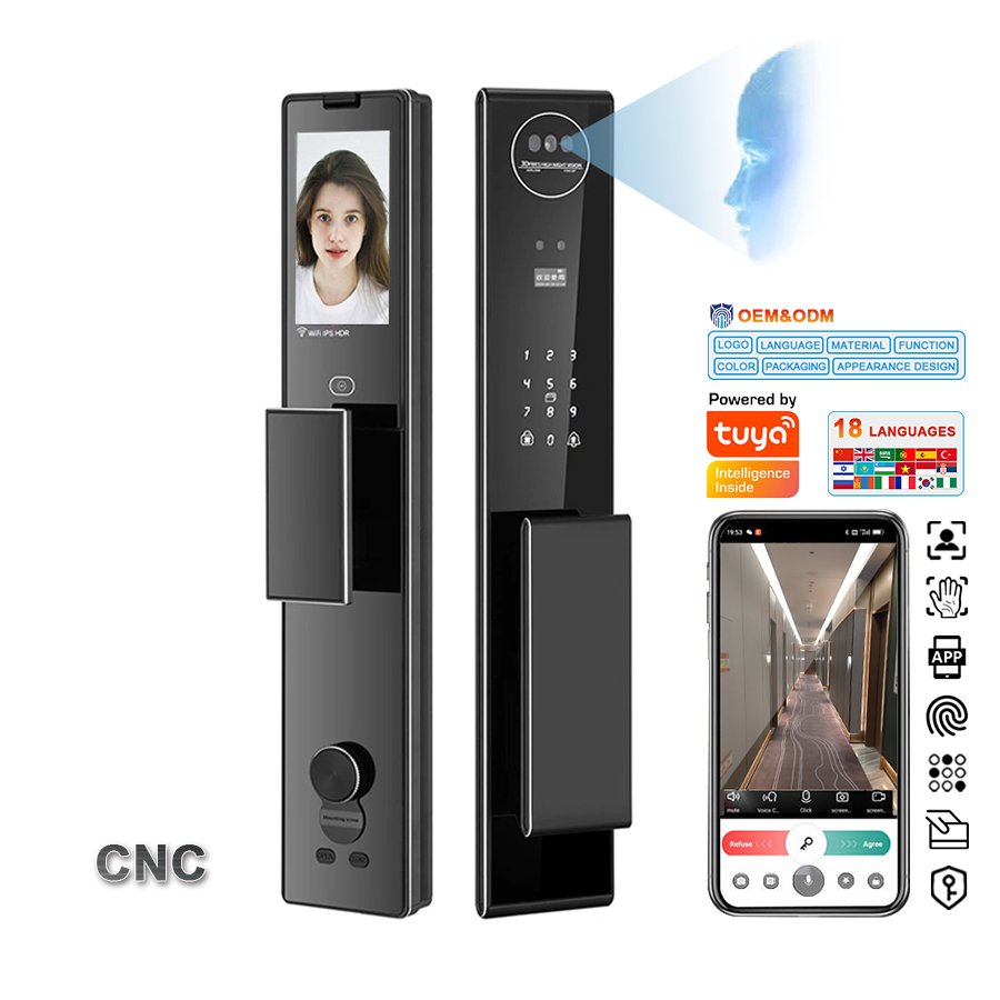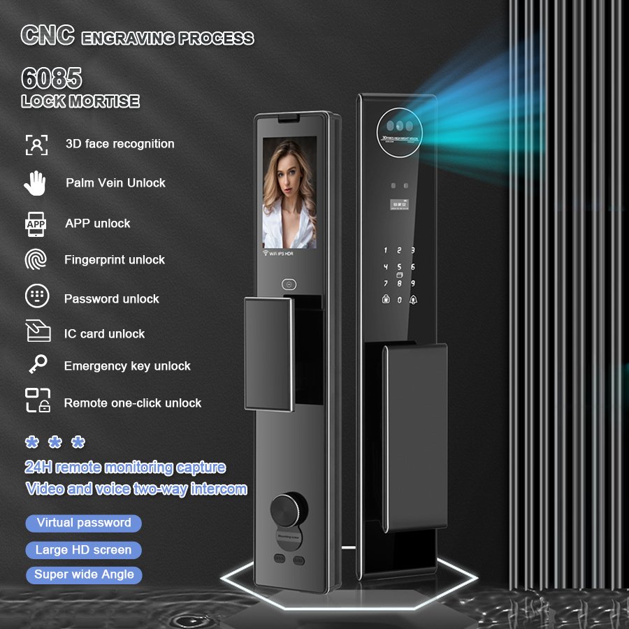 Unlocking Method: 3D Face recognition, TUYA APP, Palm vein, Fingerprint, Password, Card, Key Camera visual, Active intercom Language: Multiple languages Mortise: 6068 Material: CNC Aviation aluminum