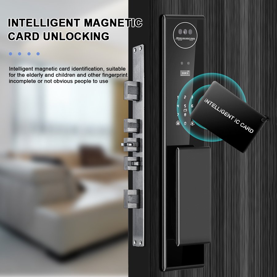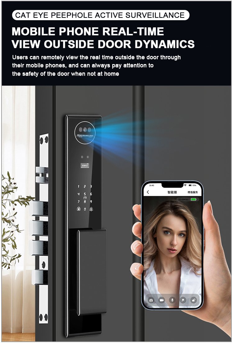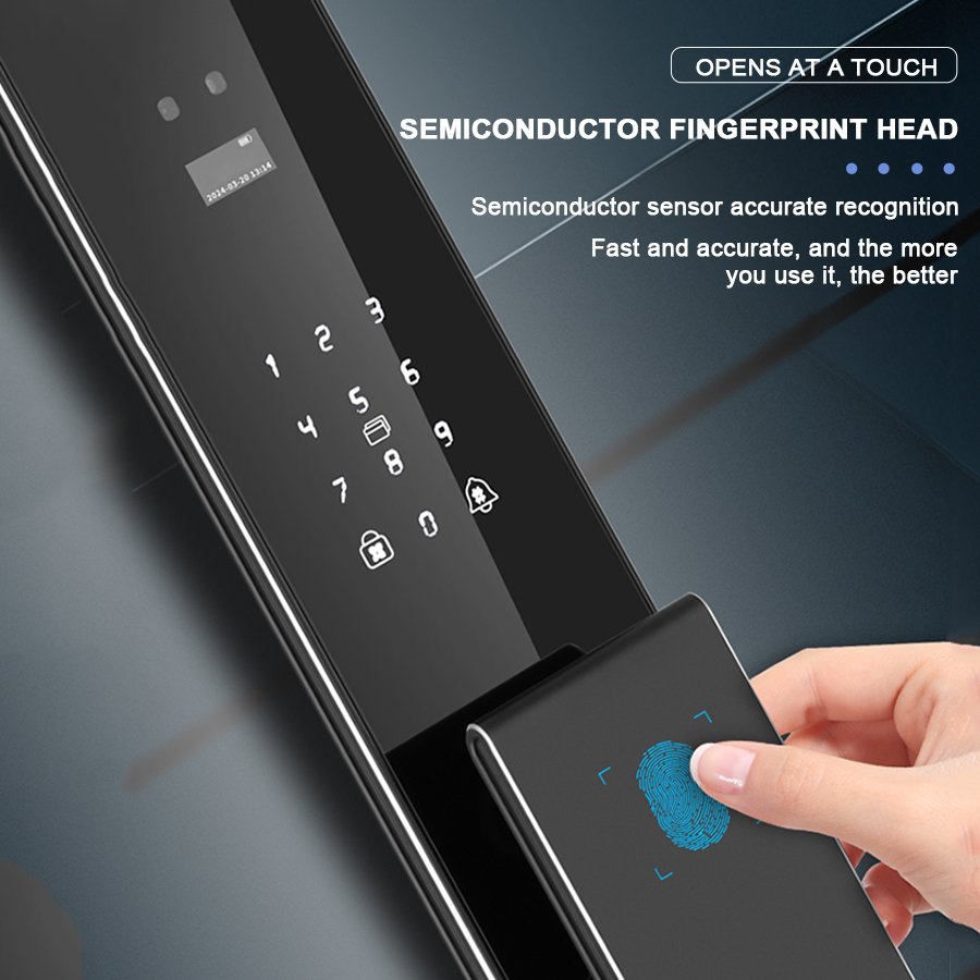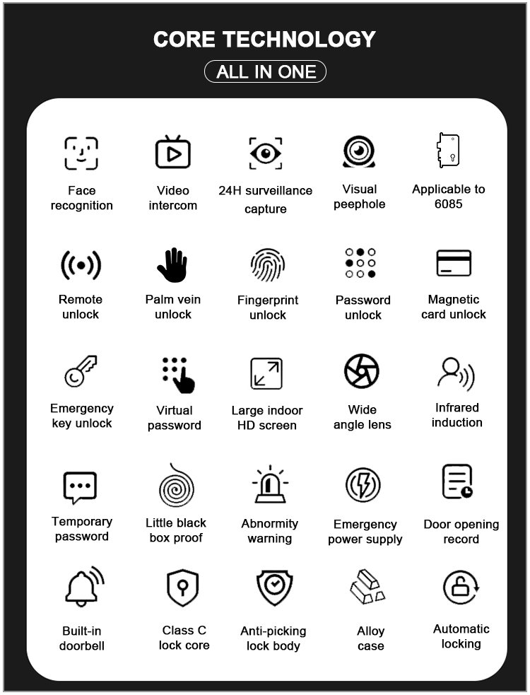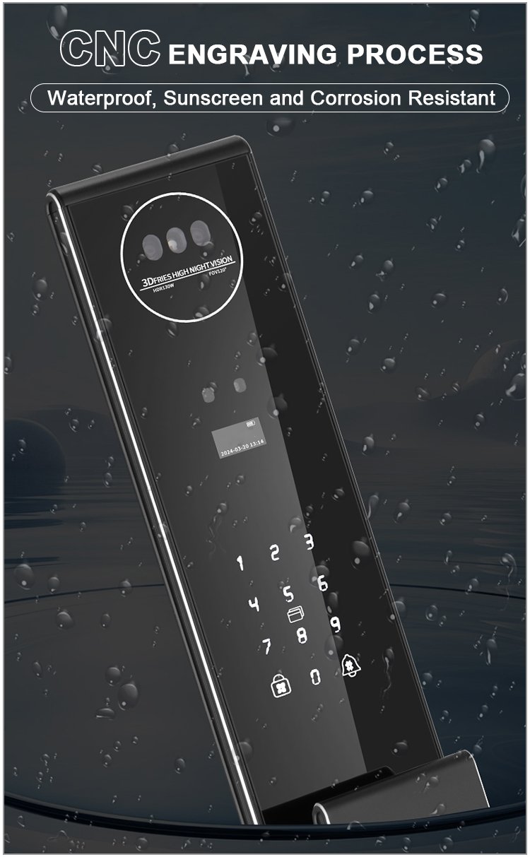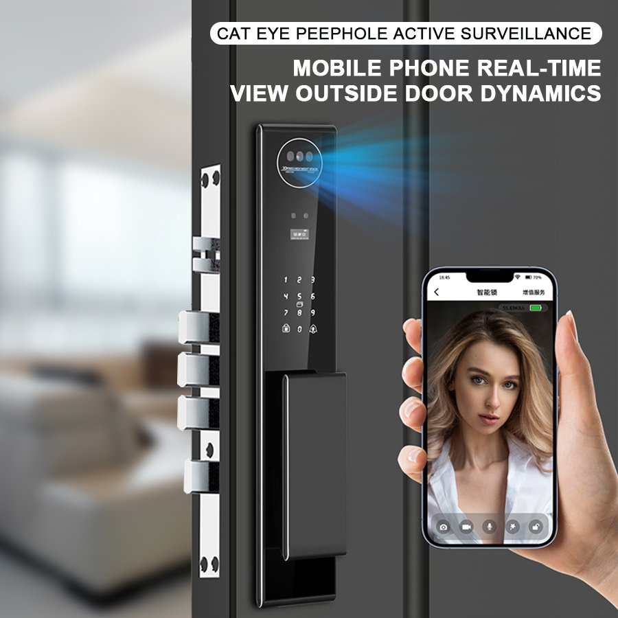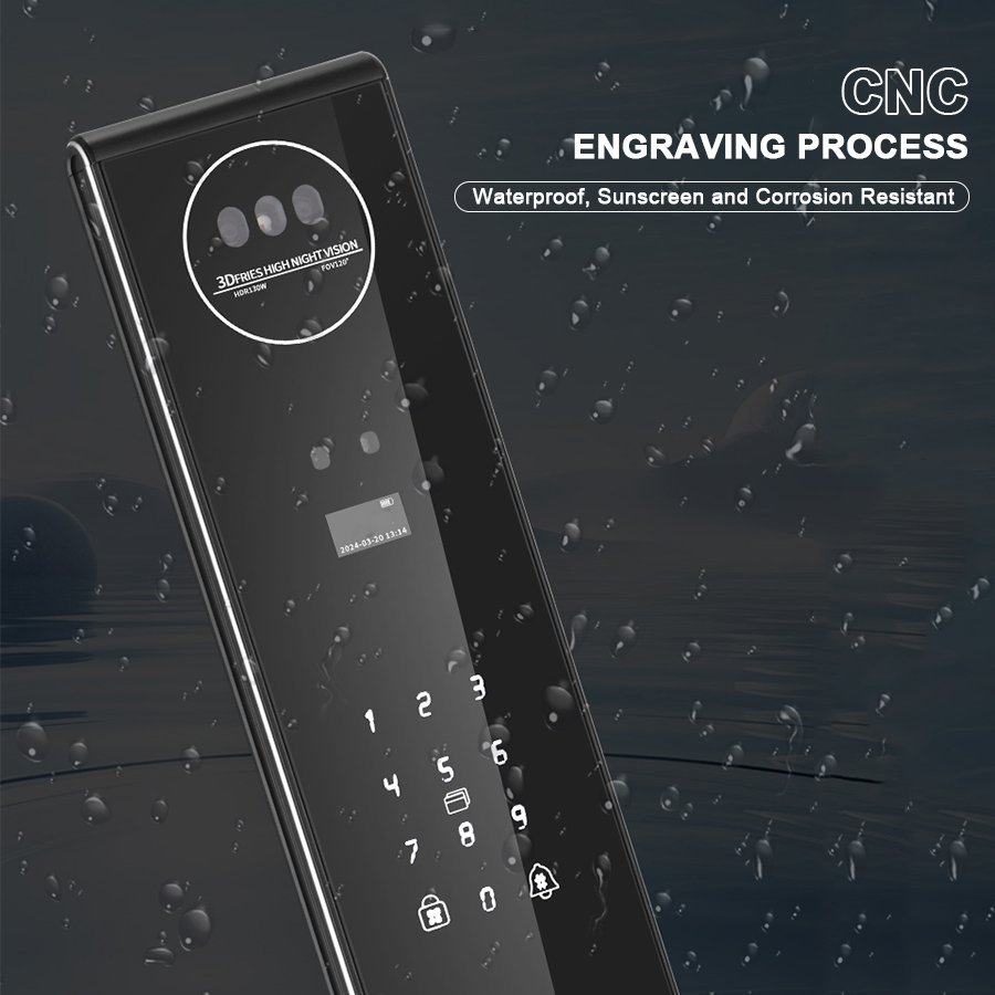 Unlocking Method: 3D Face recognition, TUYA APP, Palm vein, Fingerprint, Password, Card, Key Camera visual, Active intercom Language: Multiple languages Mortise: 6068 Material: CNC Aviation aluminum