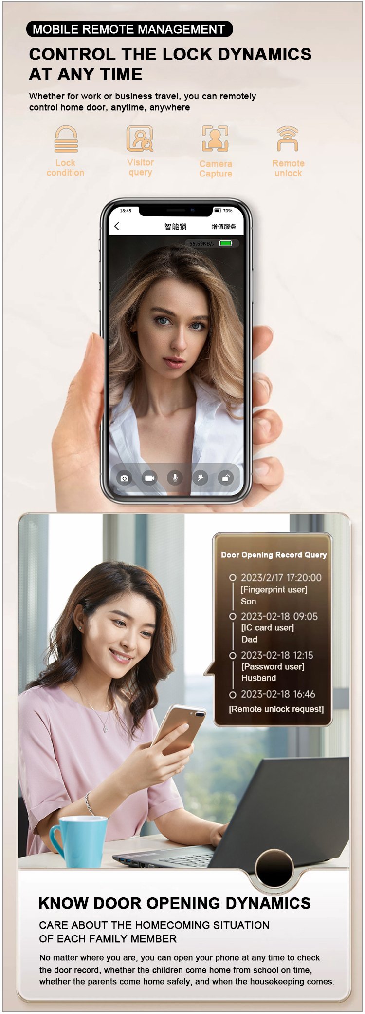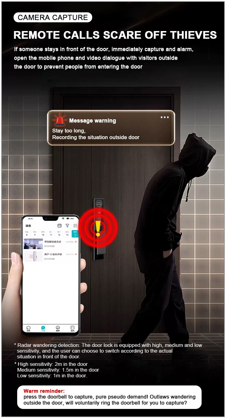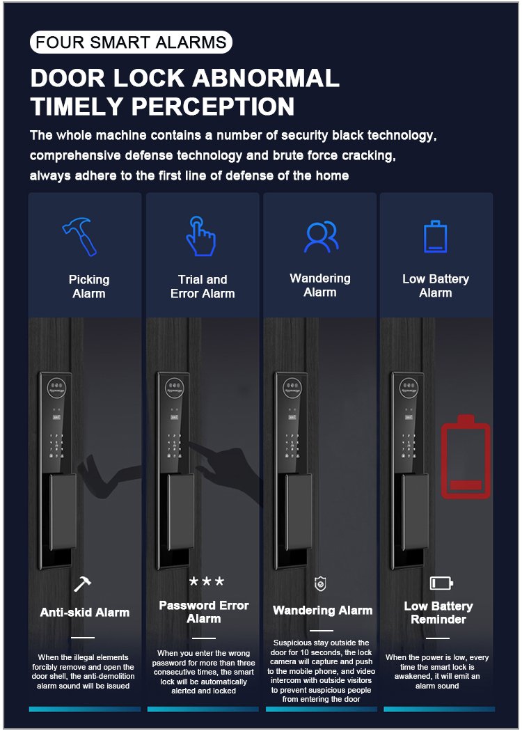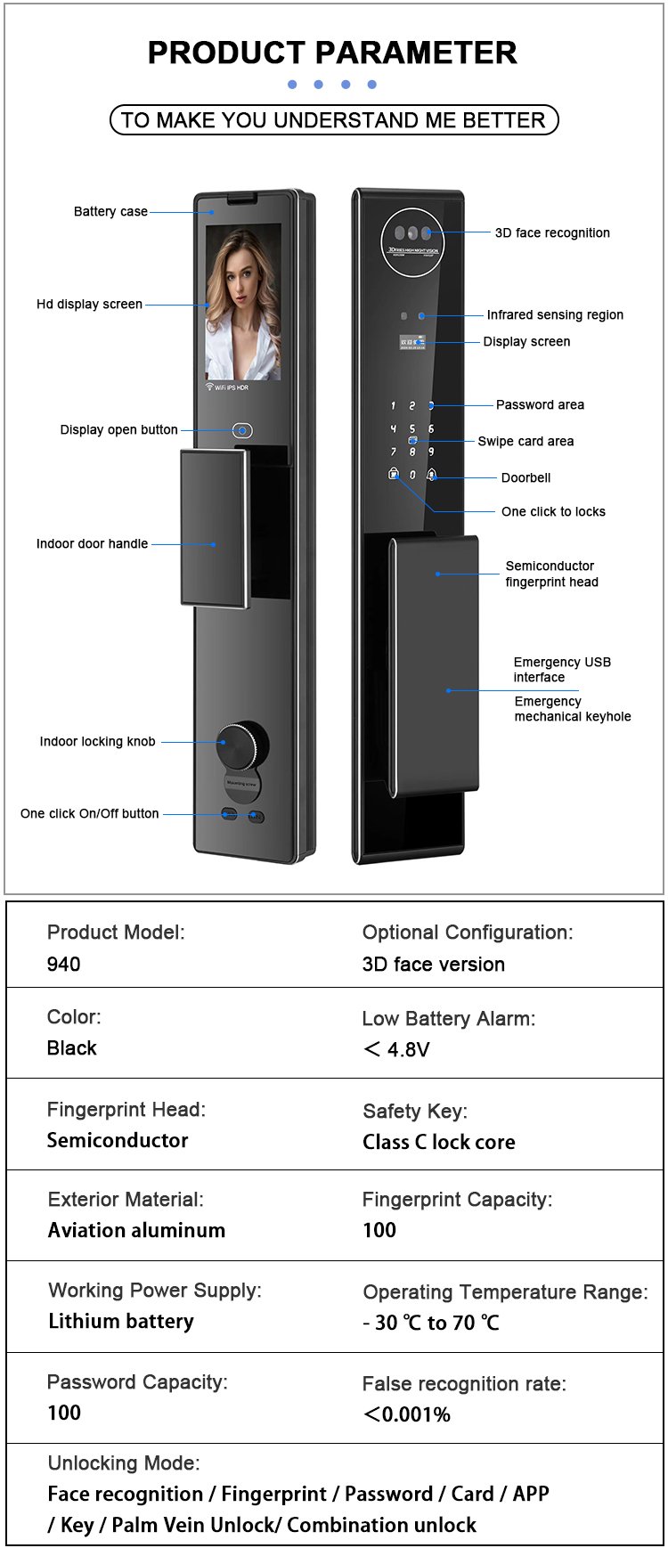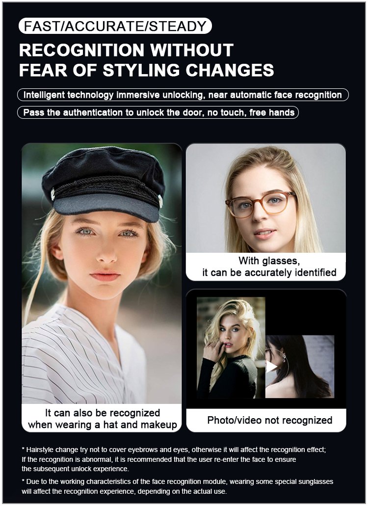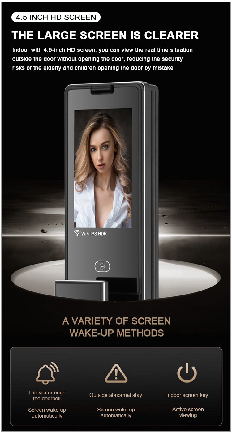 Unlocking Method: 3D Face recognition, TUYA APP, Palm vein, Fingerprint, Password, Card, Key Camera visual, Active intercom Language: Multiple languages Mortise: 6068 Material: CNC Aviation aluminum