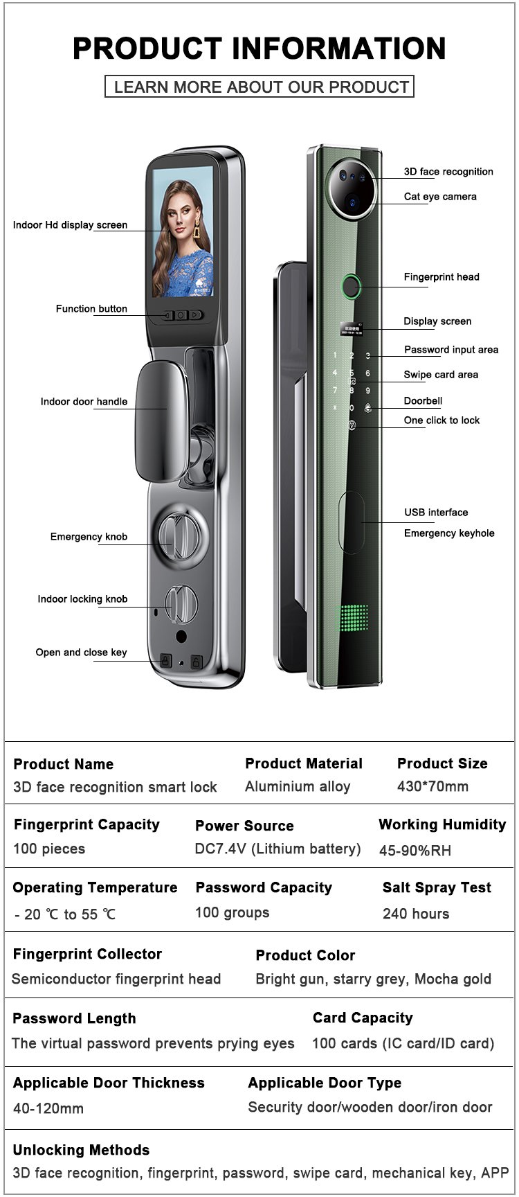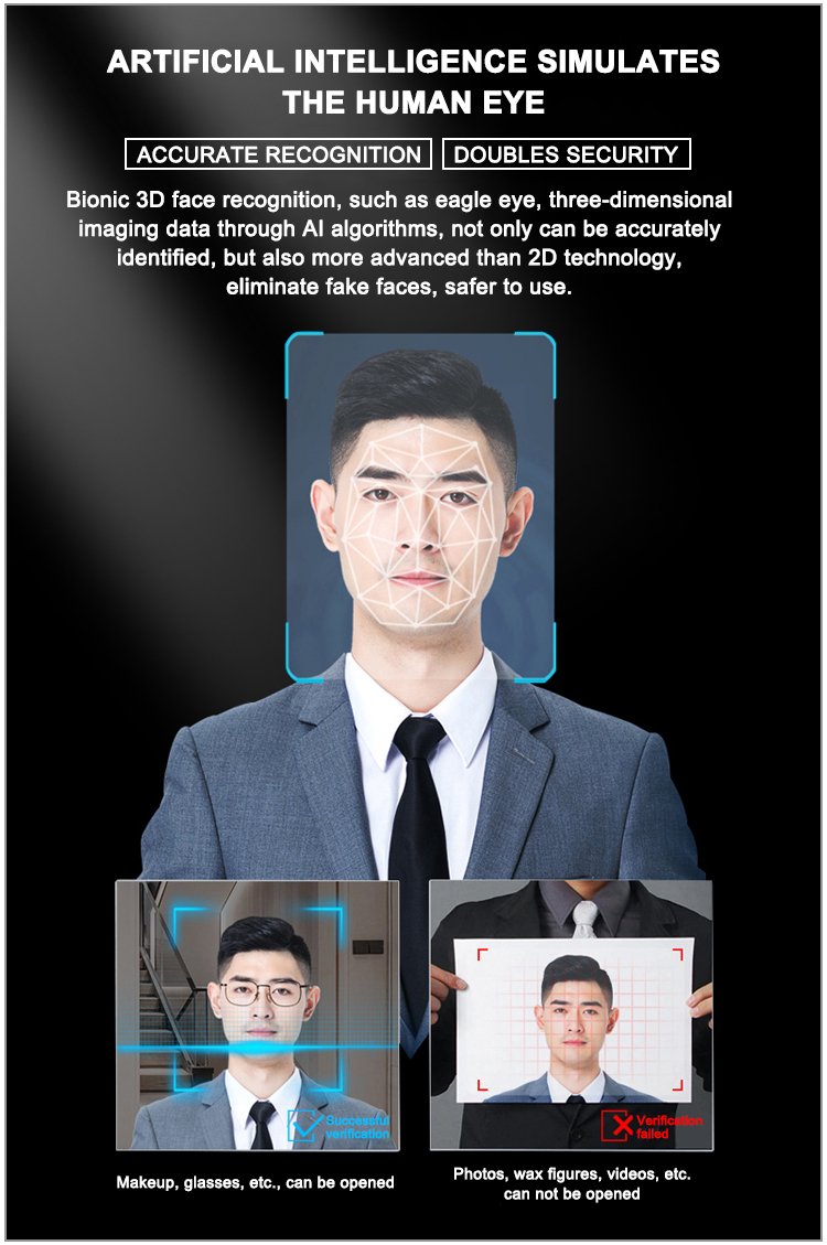 Unlocking Method: 3D Face recognition, TUYA APP, Palm vein, Fingerprint, Password, Card, Key