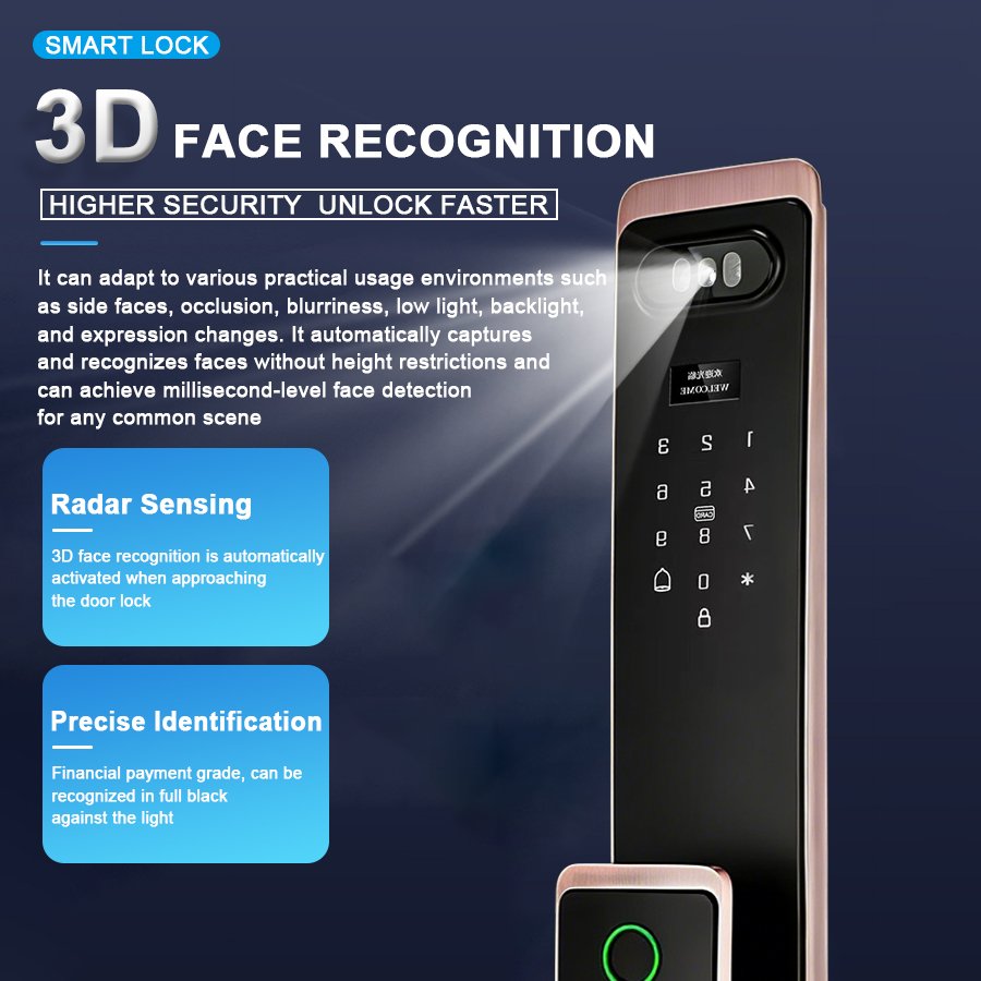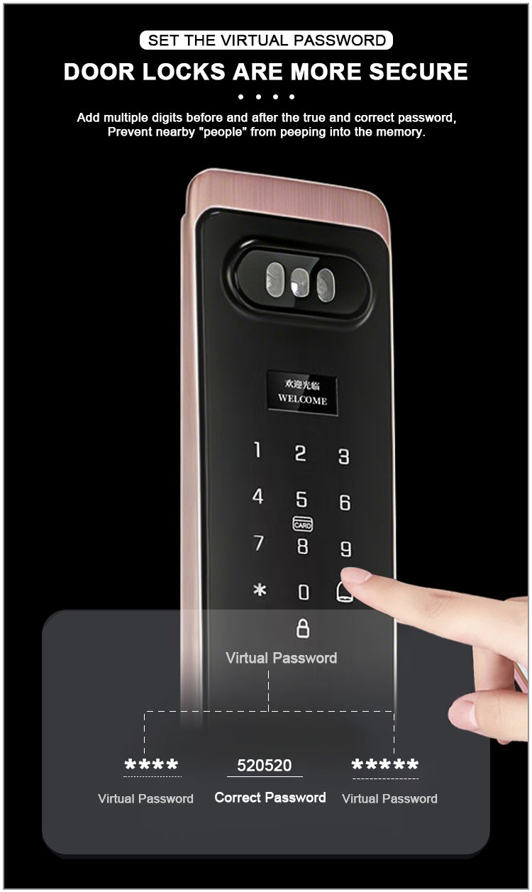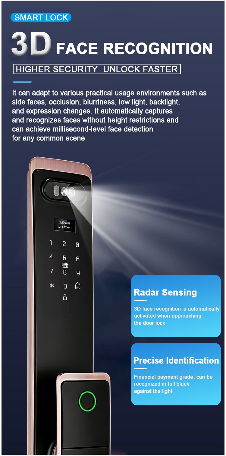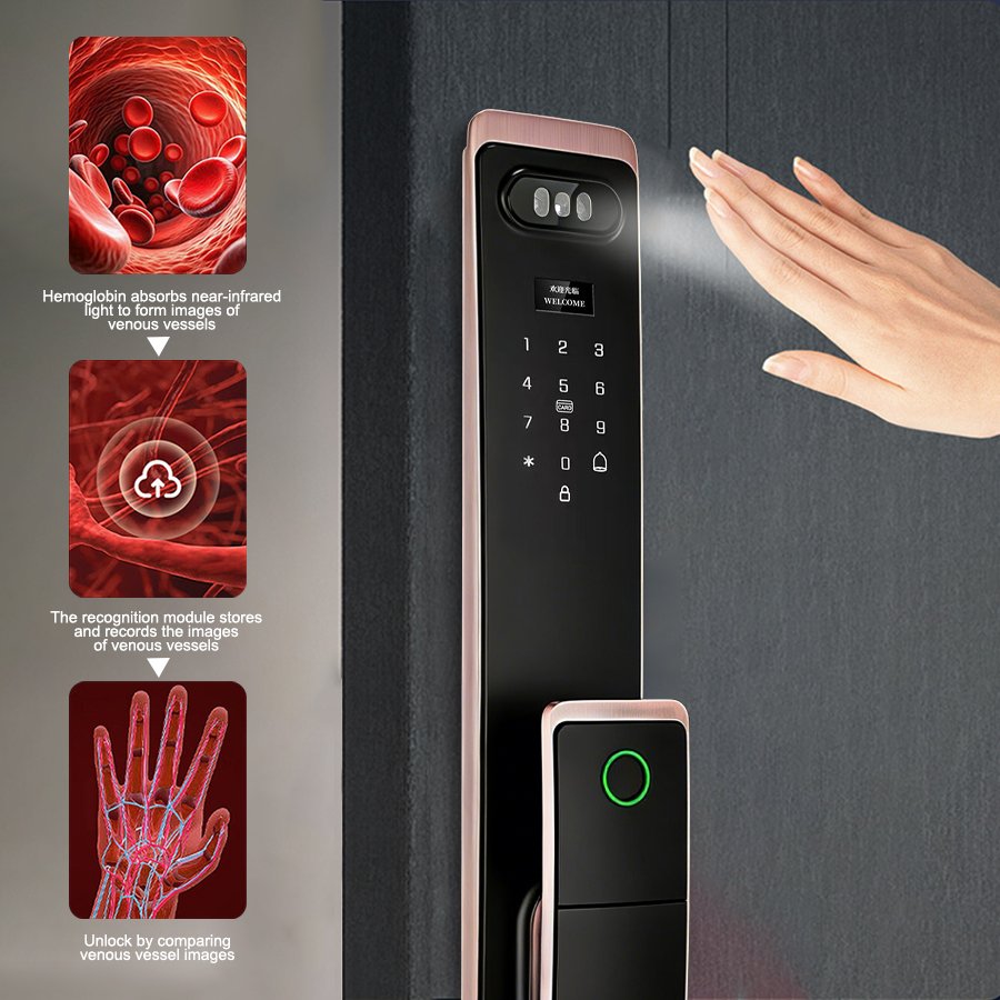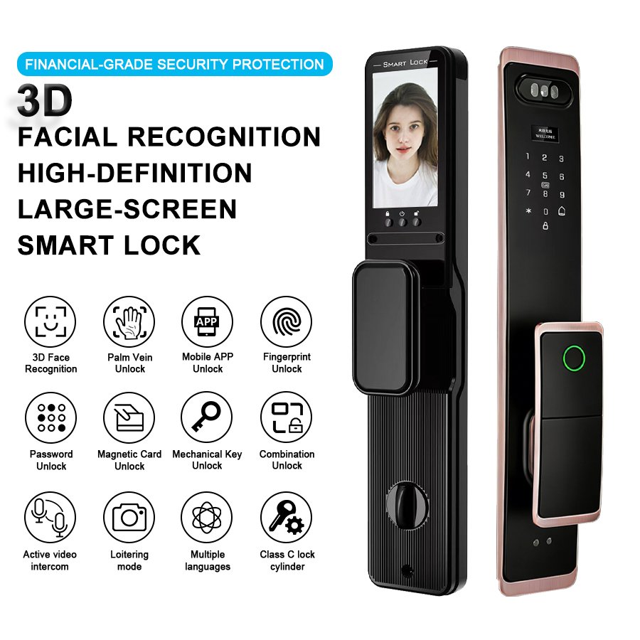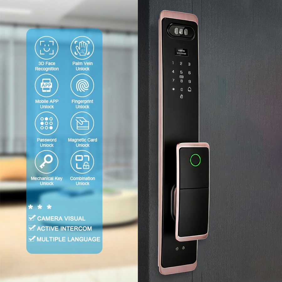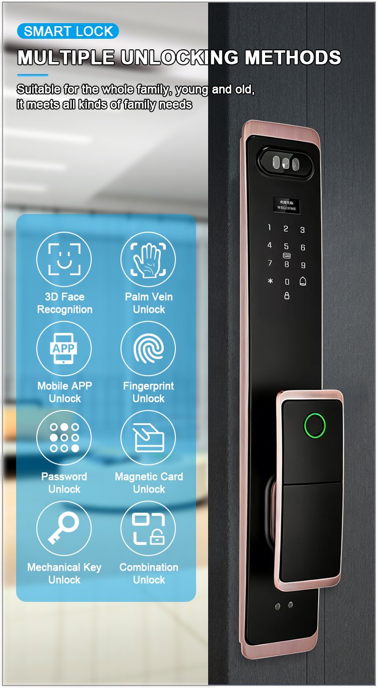 Unlocking Method: 3D Face recognition, TUYA APP, Palm vein, Fingerprint, Password, Card, Key, Combination unlock