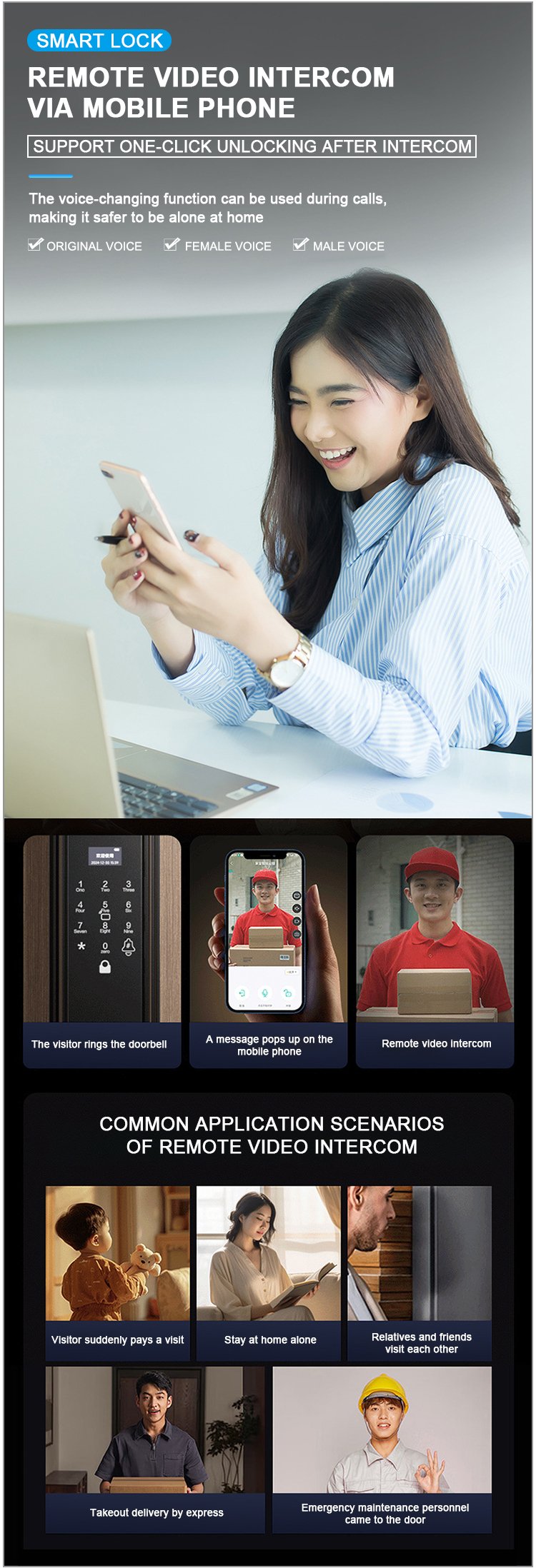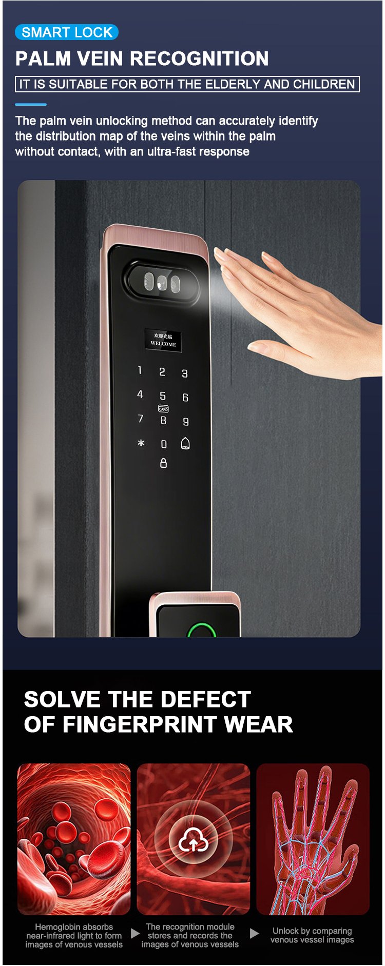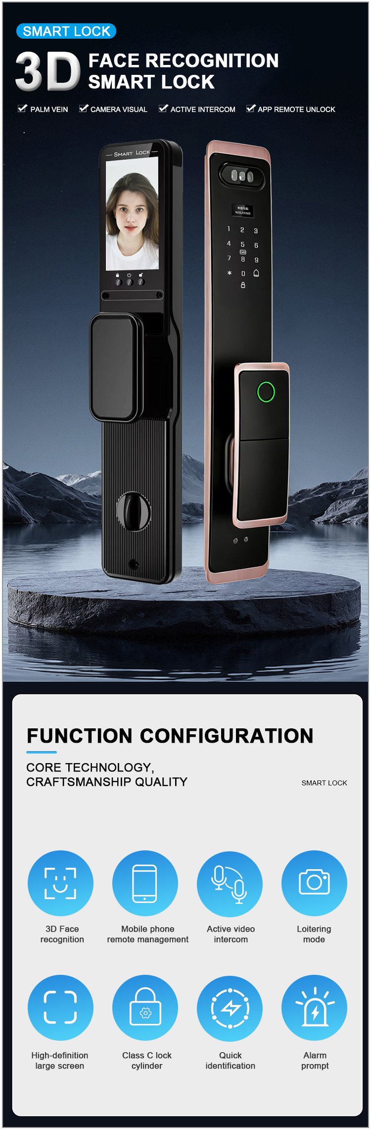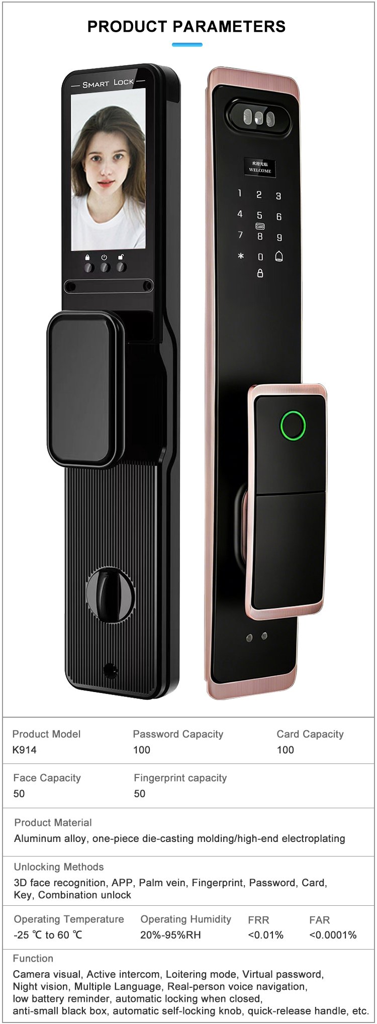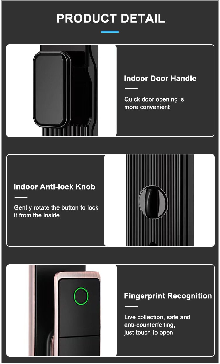 Unlocking Method: 3D Face recognition, TUYA APP, Palm vein, Fingerprint, Password, Card, Key, Combination unlock