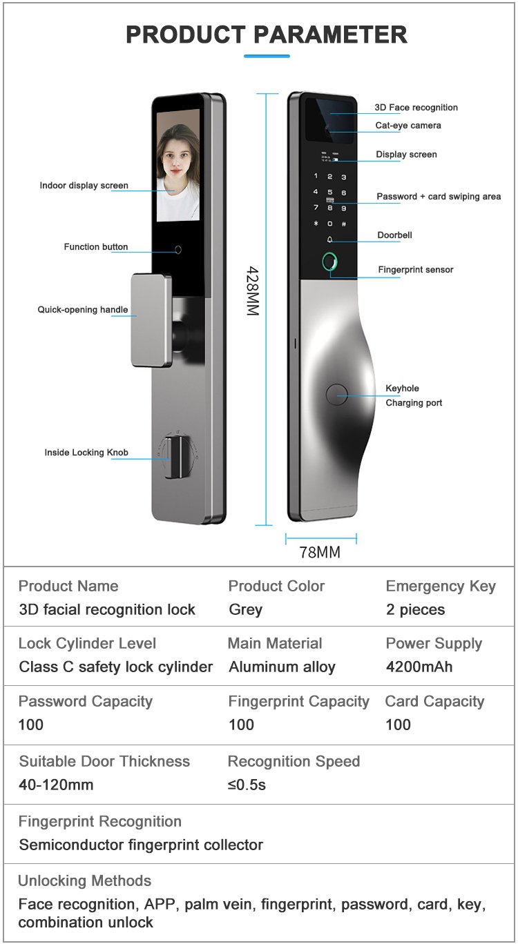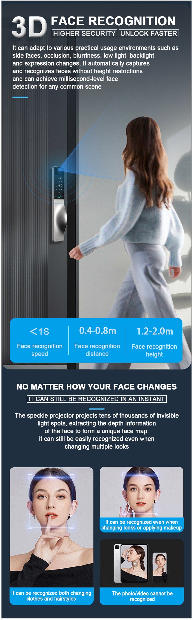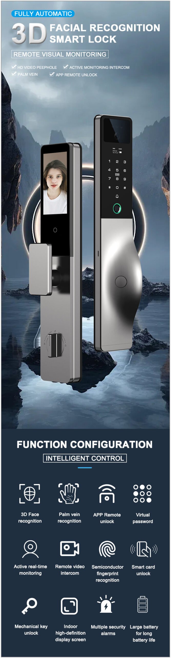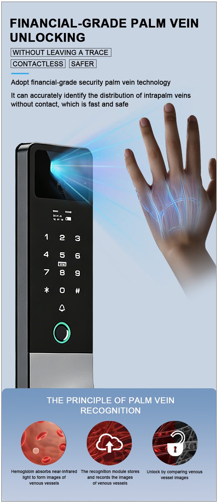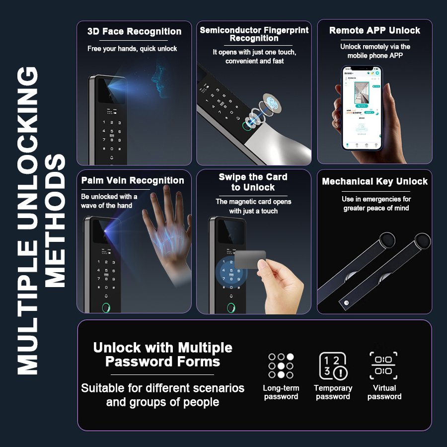 Unlocking Method: 3D Face recognition, TUYA APP, Palm vein, Fingerprint, Password, Card, Key, Combination unlock